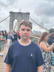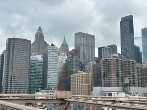 Eine der berühmtesten Brücken von New York ist die Brooklyn Bridge. Sie verbindet die Stadtteile Manhatten und Brooklyn. In der Mitte der Brücke befindet sich ein Weg für Fußgänger. Dieser liegt auch etwas höher, als die Autofahrbahnen, so dass man von oben auf die Autos schaut.