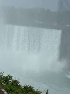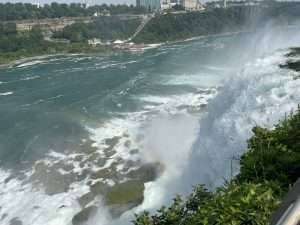 Wenn man keine Angst hat, nass zu werden, dann kann man mit einem Fahrstuhl nach unten an den Rand der American Falls fahren. Dieser Punkt wird „Cave of the Winds“ genannt, weil das Wasser beim herabstürzen einen starken Wind erzeugt. Wenn man unten steht, fühlt es sich wie ein Sturm an. Man bekommt einen Umhang, um etwas vor dem Wasser geschützt zu sein (aber man wird trotzdem nass). Und dann kann man sich dem Wasser nähern und eine Dusche mit Niagara Wasser geniessen. Es hat mir einen riesen Spass gemacht.