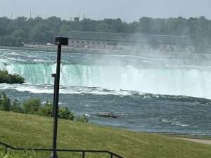 Eine zweite Möglichkeit die Kraft des Wasser richtig zu erleben, ist eine Bootstour auf dem Fluß in Richtung der Fälle. Der Eingang dafür befindet sich direkt an der Aussichtsplatform. Auch hier geht es mit einem Fahrstuhl nach unten zum Bootsanleger. Das Schiff fährt dann an den American Falls vorbei und dann direkt vor die Horseshoe Falls. Hier ist der Wind und das aufgewirbelte Wasser noch viel stärker. Wenn ich nochmal hierher kommen sollte, dann nehme ich auf jeden Fall eine Schwimmbrille mit. Es ist sonst ziemlich schwer, direkt vor den Fällen noch die Augen aufzumachen.