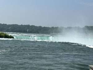 Die Niagara Fälle sind eigentlich 3 Wasserfälle. Die kleinen Bridal Veil Falls, die American Falls und die Horseshoe Falls. Die American Falls liegen komplett auf der amerikanischen Seite. Hier stürzen 285 000 Liter Wasser pro Sekunde in die Tiefe. Die Horseshoe Falls liegen auf der Grenze zwischen USA und Kanada. Hier sind es sogar 2 555 150 Liter pro Sekunde. Ich fand es sehr beeindruckend, wie laut das Wasser ist, wenn es hinabstürtzt. Am sogenannten Prospect Point steht man auf der rechten Seite der American Falls und hat einen schönen Blick über den Niagara-Fluss nach Kanada. Hier gibt es auch eine Aussischtplattform, die sich über dem Fluss befindet. Über eine Fußgängerbrücke gelangt man auf die kleine Insel Goat Island. Dort steht man an der anderen Seite der American Falls und gelangt zu den Horseshoe Falls.