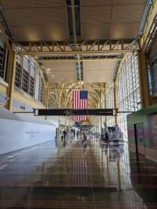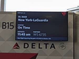 Heute geht es auf die nächste Etappe unserer Reise. Wir fliegen nach New York. Vom Hotel wurden wir mit 2 Autos abgeholt und waren in ca. 20 Minuten am Flughafen Ronald Reagan. Am Check-In Schalter wunderte sich die Angestellte über das viele Gepäck, dass wir dabei hatten. Mein Bruder erzählte dann, das er ein Jahr in den USA gelebt hat. Daraufhin wollte die Angestellte noch wissen, was er so gemacht hat und was er am meisten in den USA vermisst hat. Da merkte man, wie gut mein Bruder hier Englisch gelernt hat, denn er hat sich wie ein echter Amerikaner unterhalten. Wir konnten pünktlich in unser Flugzeug einsteigen, aber leider verspätete sich der Start um eine Stunde. Bei der Landung in New York hat man schon von oben gesehen, wie riesig diese Stadt ist.